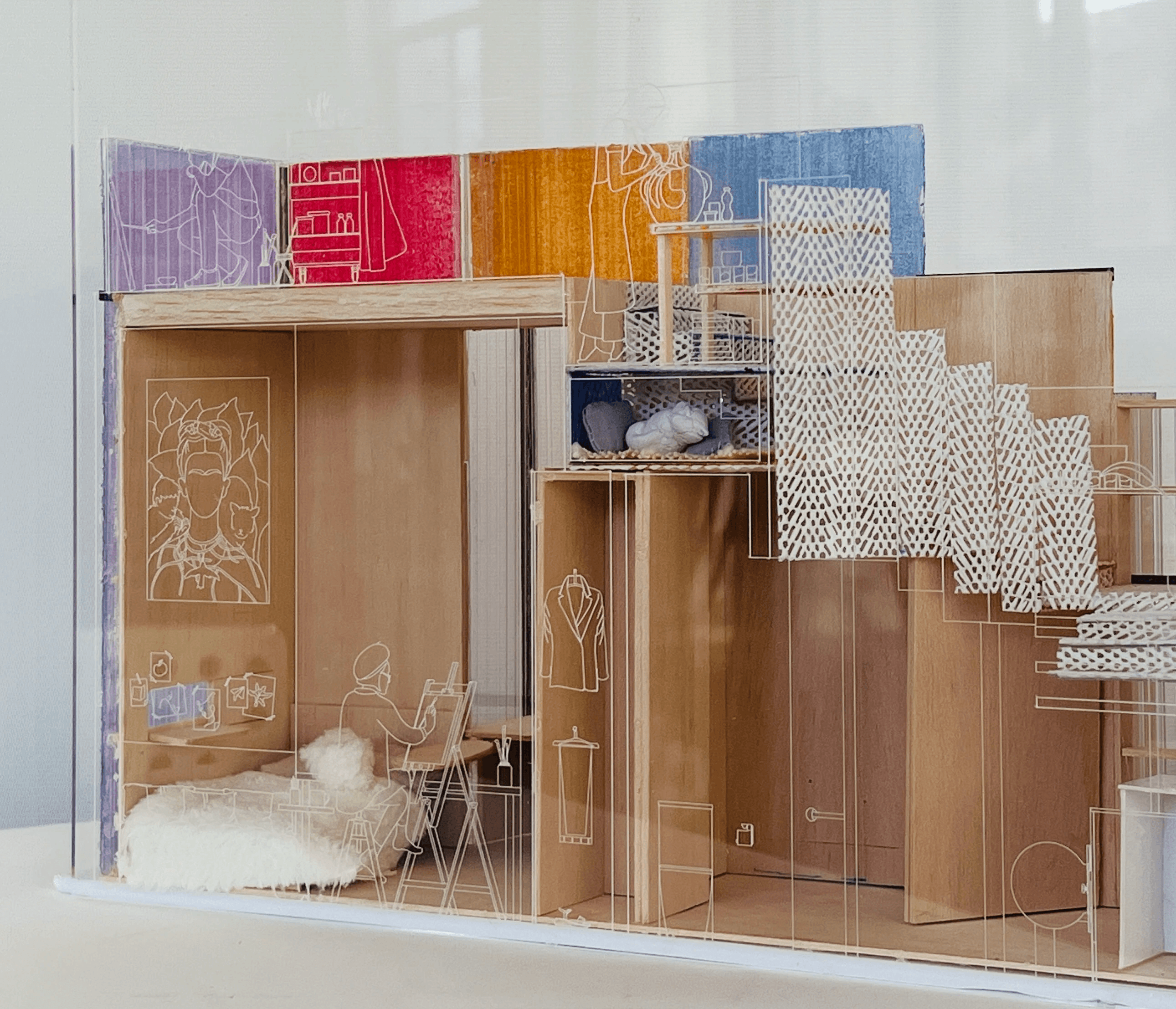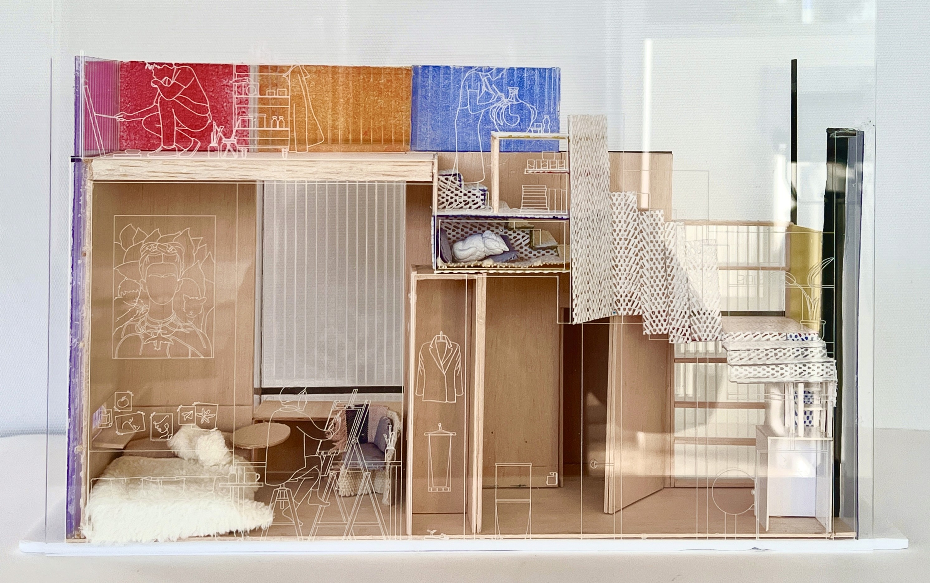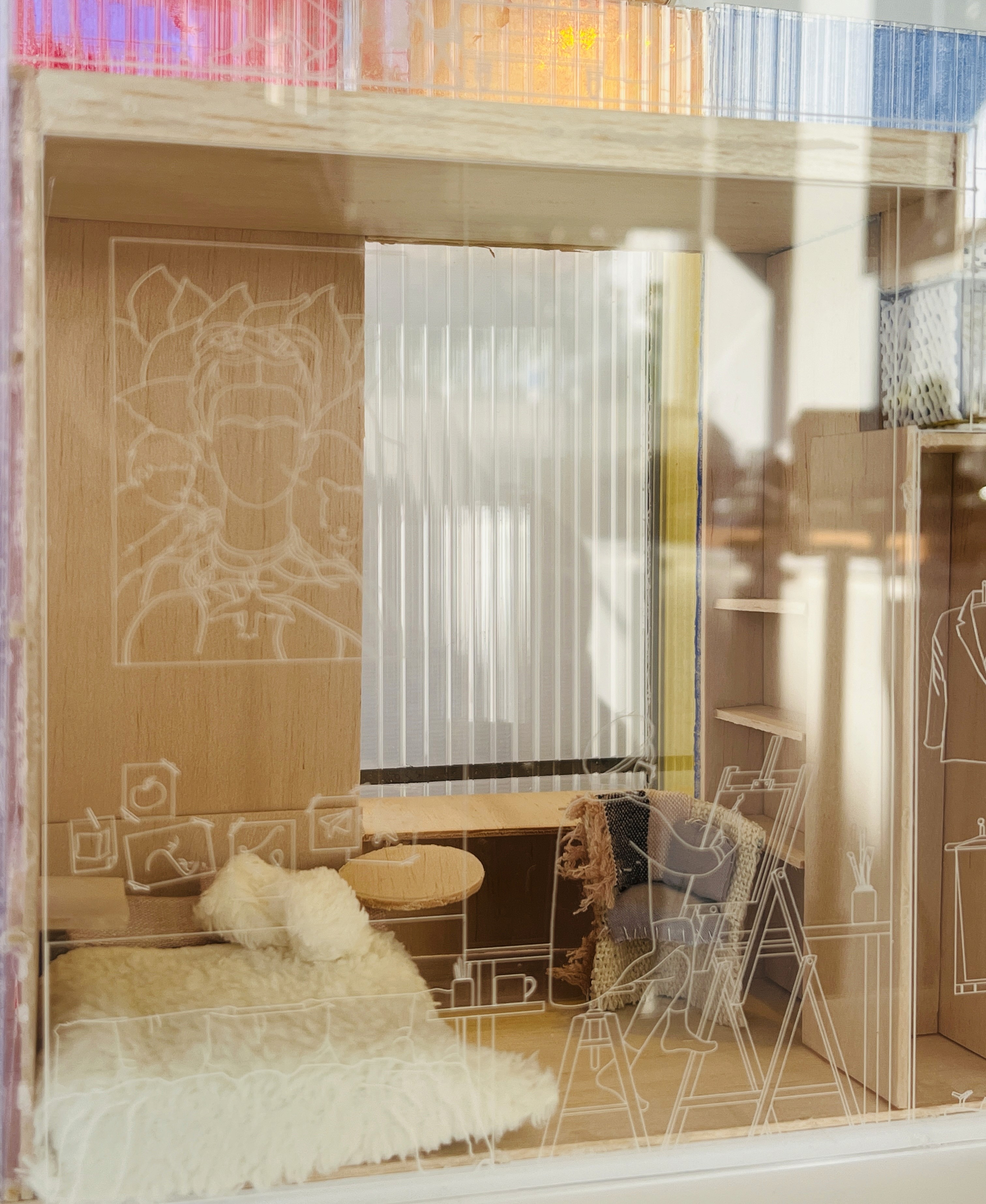 This architecture must adeptly transition from providing a tranquil haven for personal reflection to accommodating a multitude of guests. Flexibility is paramount to meet the diverse needs of its inhabitants. Recognising that innerworlds are inherently influenced by external forces, the act of painting on the polycarbonate walls can dynamically alter the space’s ambiance, underscoring the profound impact of social interaction on individuals.